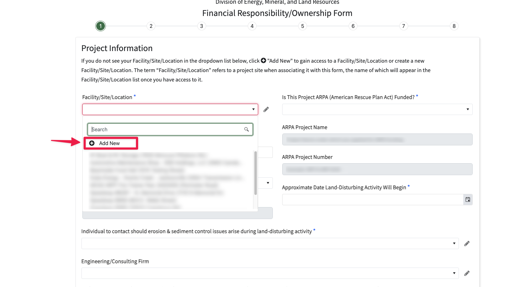 From the Facility/Location/Site listbox, click on the "+ Add New" icon