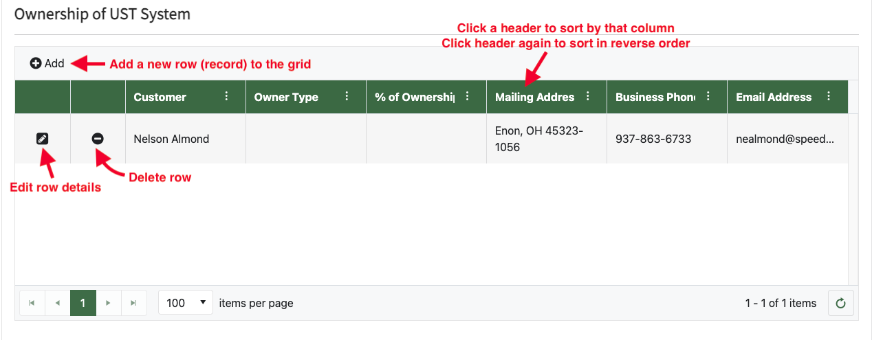 When you see a table grid, it will normally appear blank (no rows). To add a row, click on the "+ Add" or "+ Add New" icon/text on the top left of the grid