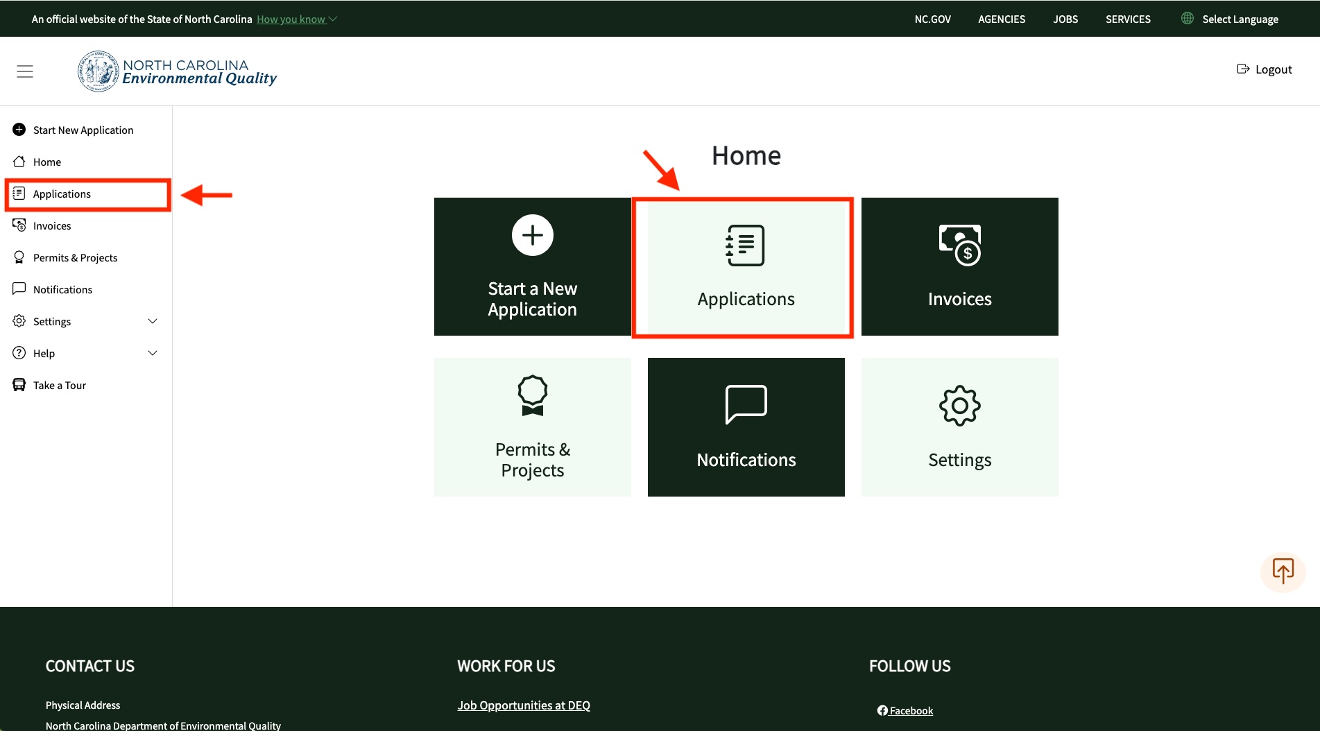 • From the Home screen, click on the "Applications" tile or menu item on the menu nav on the left side of the screen