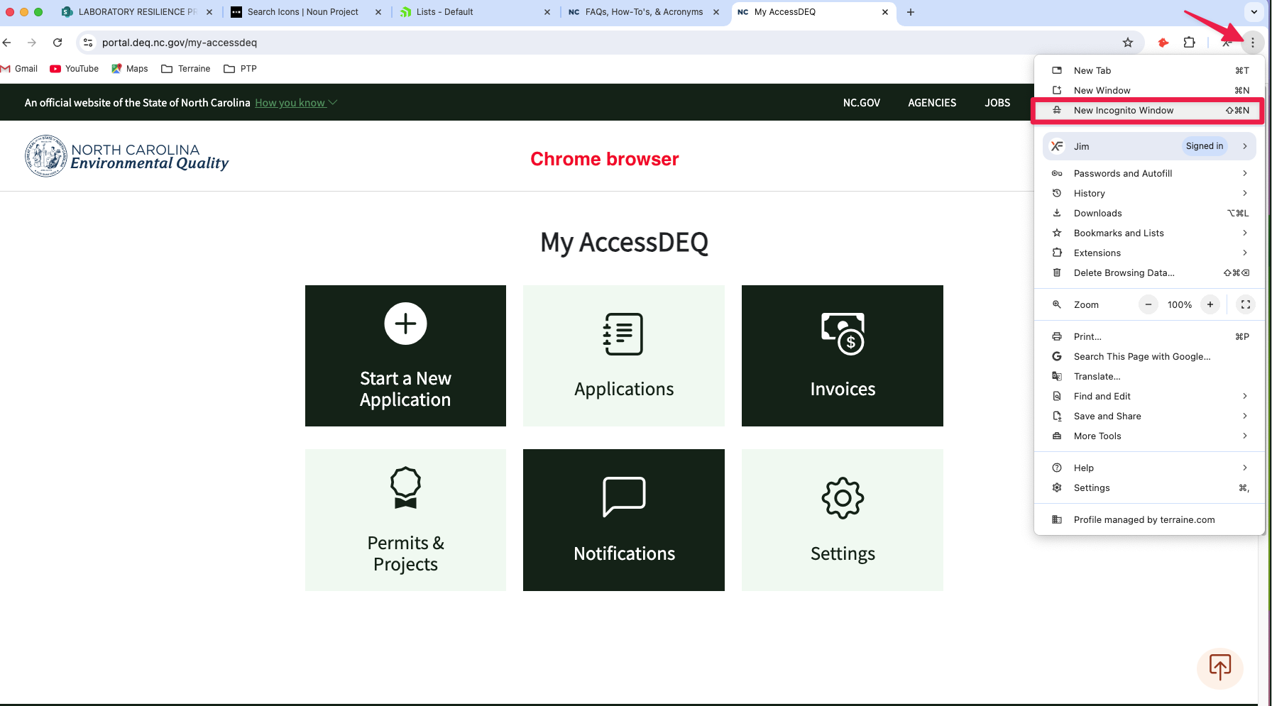 In Incognito, none of your browsing history, cookies and site data, or information entered in forms are saved on your device. This means your activity doesn't show up in your Chrome browser history, so people who also use your device won't see your activity.  And in terms of cached files, nothing cached by your browser is used when serving up a website page in incognito mode.  That means that instead of using cached files to serve up a website page, the browser will visit the website and request fresh content from that website page, thus avoiding anything old and/or corrupted.  This often will resolve issues you might be experiencing with DEQ's external portal.