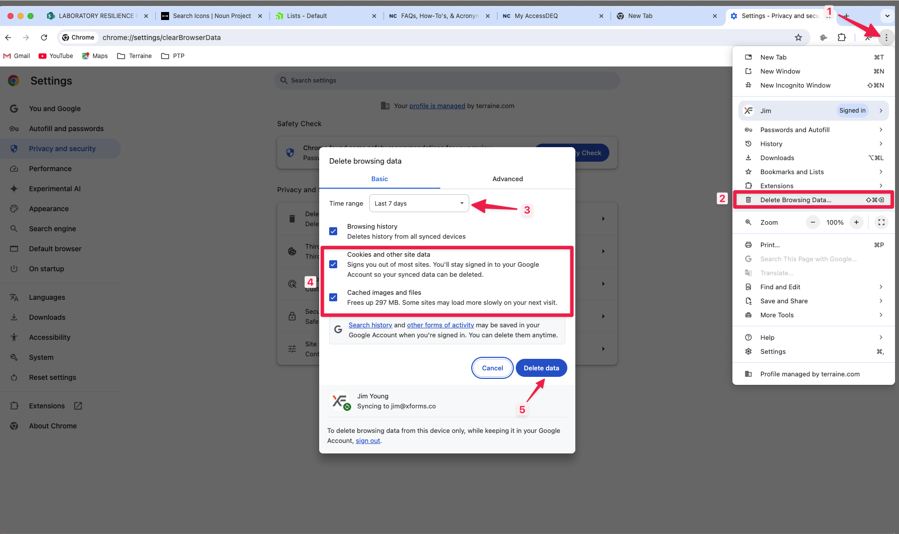 3. In Chrome, select a time range, check the boxes for Cookies and Cached Images, and click on the "Delete Data" button