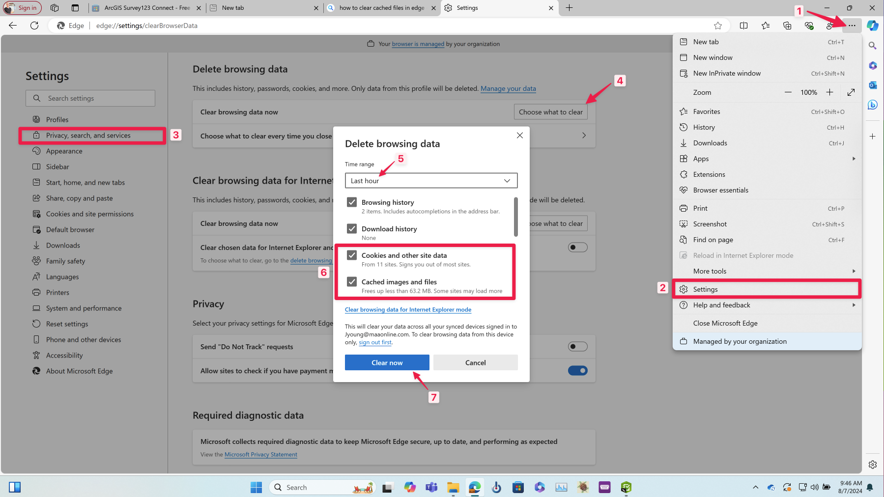 4. In Edge, scroll to the "Delete browsing data" section, click on the "Choose what to clear" button, select a time range, check to boxes for Cookies and Cached Images, and click on the "Clear Now" button